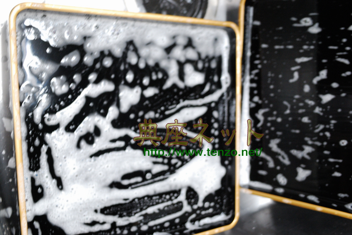 ぬるま湯と洗剤で丁寧に洗います。古い漆器を再生させるときには洗い方にもコツがあるのです。